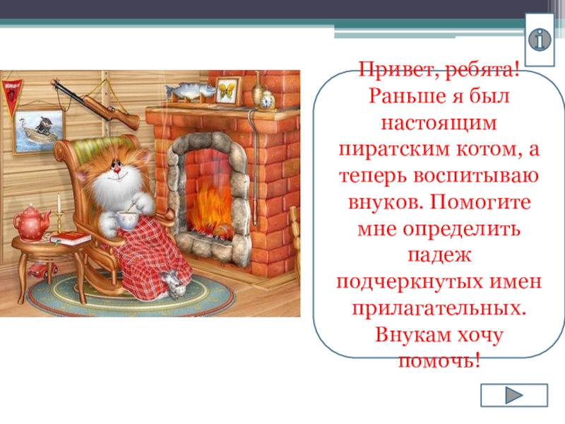 Привет, ребята!Раньше я был настоящим пиратским котом, а теперь воспитываю внуков. Помогите мне определить падеж подчеркнутых имен прилагательных. Внукам хочу помочь!