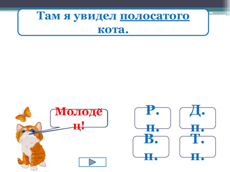 Там я увидел полосатого кота.Р. п.Д.п.В. п.Т. п.Подумай!Молодец!