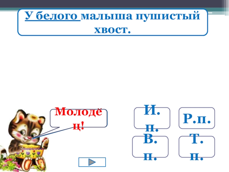 У белого малыша пушистый хвост.И. п.Р.п.В. п.Т. п.Подумай!Молодец!