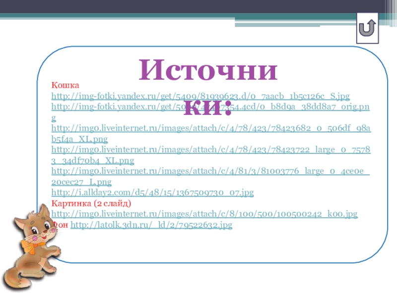Кошка http://img-fotki.yandex.ru/get/5409/81939623.d/0_7aacb_1b5c126c_S.jpghttp://img-fotki.yandex.ru/get/5009/47407354.4cd/0_b8d9a_38dd8a7_orig.pnghttp://img0.liveinternet.ru/images/attach/c/4/78/423/78423682_0_506df_98ab5f4a_XL.pnghttp://img0.liveinternet.ru/images/attach/c/4/78/423/78423722_large_0_75783_34df70b4_XL.pnghttp://img0.liveinternet.ru/images/attach/c/4/81/3/81003776_large_0_4ce0e_20cec27_L.pnghttp://i.allday2.com/d5/48/15/1367509730_07.jpgКартинка (2 слайд) http://img0.liveinternet.ru/images/attach/c/8/100/500/100500242_k00.jpgФон http://latolk.3dn.ru/_ld/2/79522632.jpgИсточники: