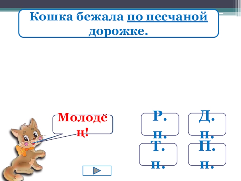 Подумай!Кошка бежала по песчаной дорожке.Р. п.Д.п.Т. п.П. п.Молодец!