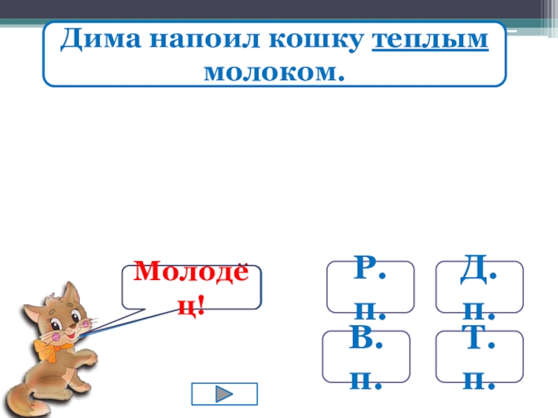 Дима напоил кошку теплым молоком.Р. п.Д.п.В. п.Т. п.Подумай!Молодец!