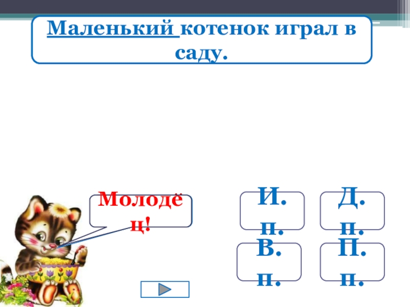 Маленький котенок играл в саду.И. п.Д.п.В. п.П. п.Подумай!Молодец!