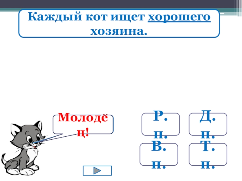 Подумай!Каждый кот ищет хорошего хозяина.Р. п.Д.п.В. п.Т. п.Молодец!