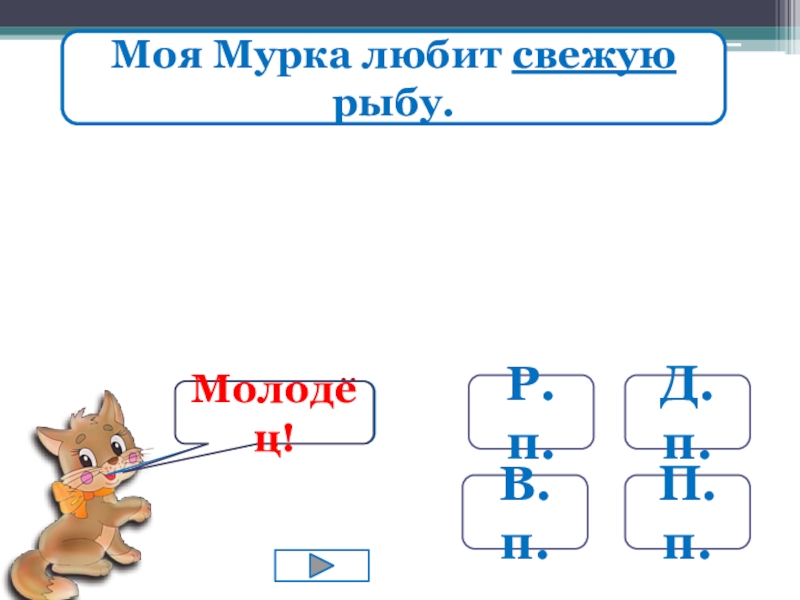 Подумай!Моя Мурка любит свежую рыбу.Р. п.Д.п.В. п.П. п.Молодец!