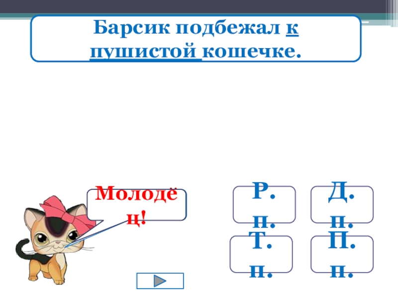 Барсик подбежал к пушистой кошечке.Р. п.Д.п.Т. п.П. п.Подумай!Молодец!