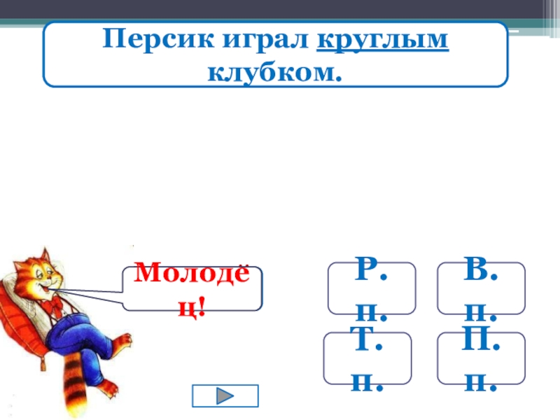Подумай!Персик играл круглым клубком.Р. п.В.п.Т. п.П. п.Молодец!