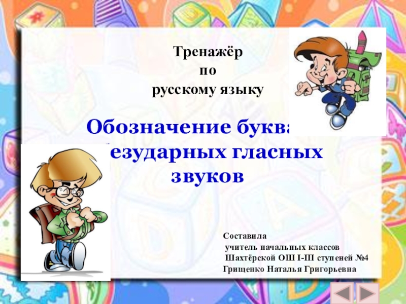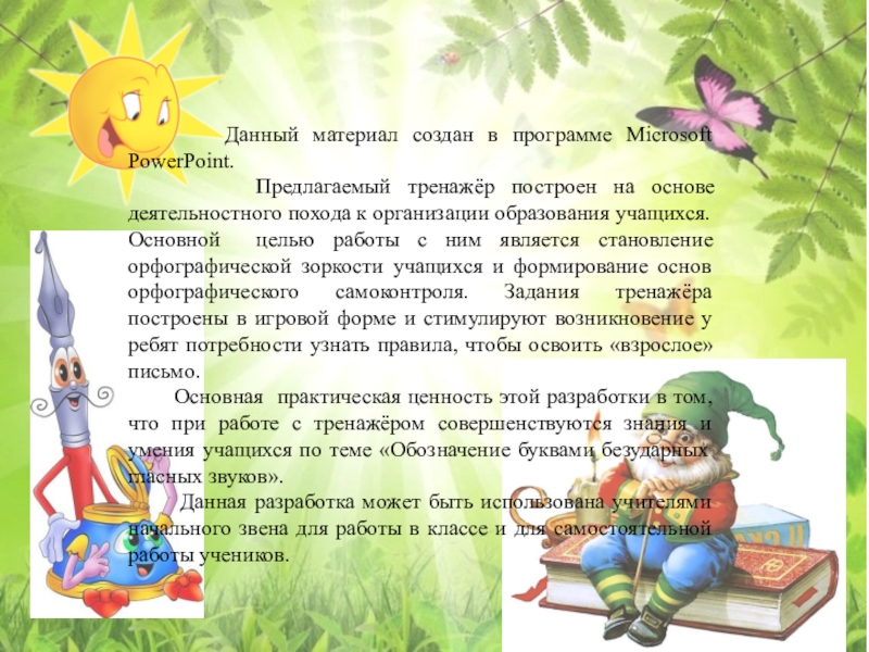 Основная практическая ценность этой разработки в том, что при работе с тренажёром совершенствуются знания и умения учащихся по теме «Обозначение буквами безударных гласных звуков».