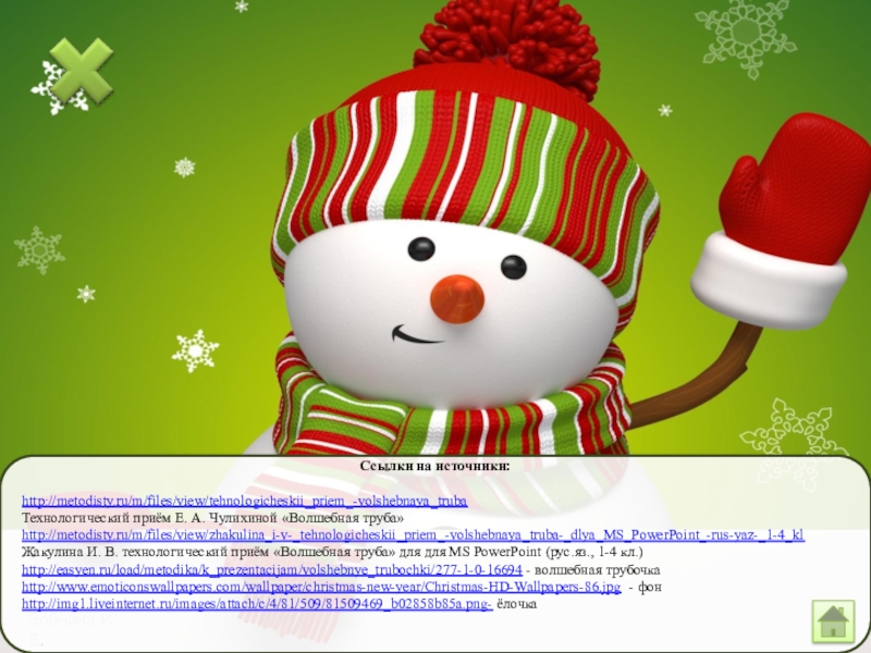 Ссылки на источники:http://metodisty.ru/m/files/view/tehnologicheskii_priem_-volshebnaya_trubaТехнологический приём Е. А. Чулихиной «Волшебная труба»http://metodisty.ru/m/files/view/zhakulina_i-v-_tehnologicheskii_priem_-volshebnaya_truba-_dlya_MS_PowerPoint_-rus-yaz-_1-4_kl Жакулина И. В. технологический приём «Волшебная труба» для