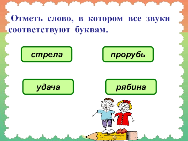 Слайд 2 Отметь слово, в котором все звуки соответствуют буквам.