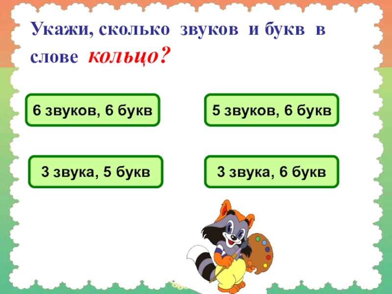 Слайд 7Укажи, сколько звуков и букв в слове кольцо?