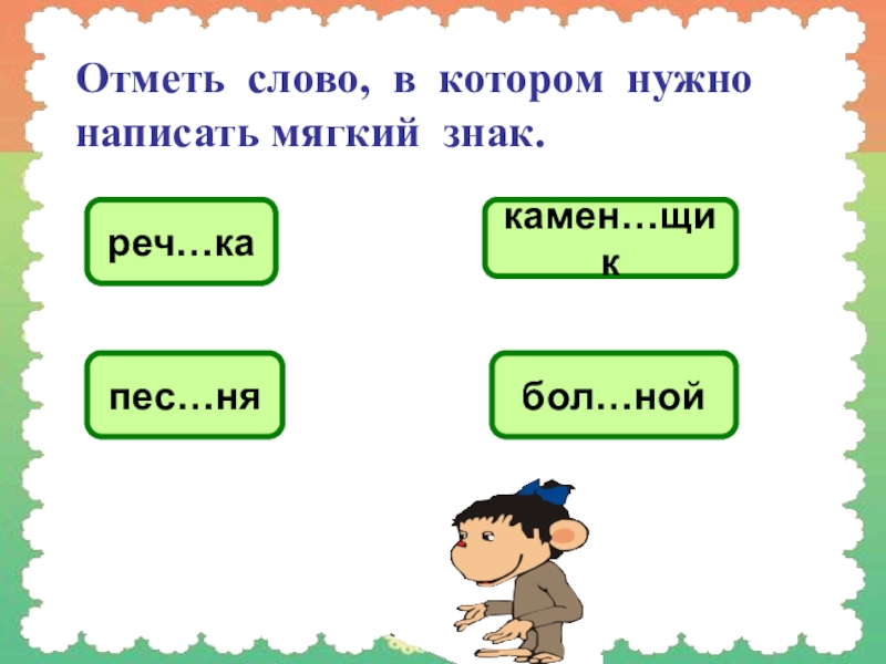 Слайд 10Отметь слово, в котором нужно написать мягкий знак.