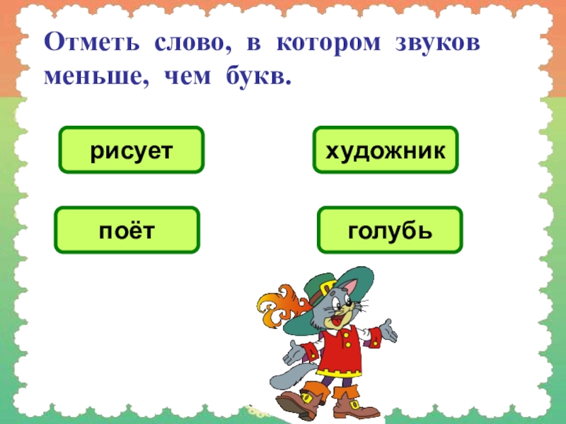 Отметь слово, в котором звуков меньше, чем букв.рисуетхудожникпоётголубь