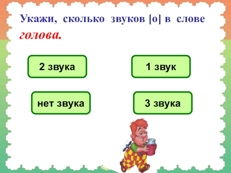 Слайд 9Укажи, сколько звуков [о] в слове голова.
