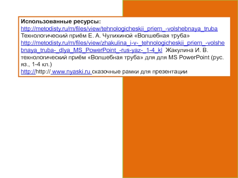 Использованные ресурсы:http://metodisty.ru/m/files/view/tehnologicheskii_priem_-volshebnaya_trubaТехнологический приём Е. А. Чулихиной «Волшебная труба»http://metodisty.ru/m/files/view/zhakulina_i-v-_tehnologicheskii_priem_-volshebnaya_truba-_dlya_MS_PowerPoint_-rus-yaz-_1-4_kl Жакулина И. В. технологический приём «Волшебная труба» для для