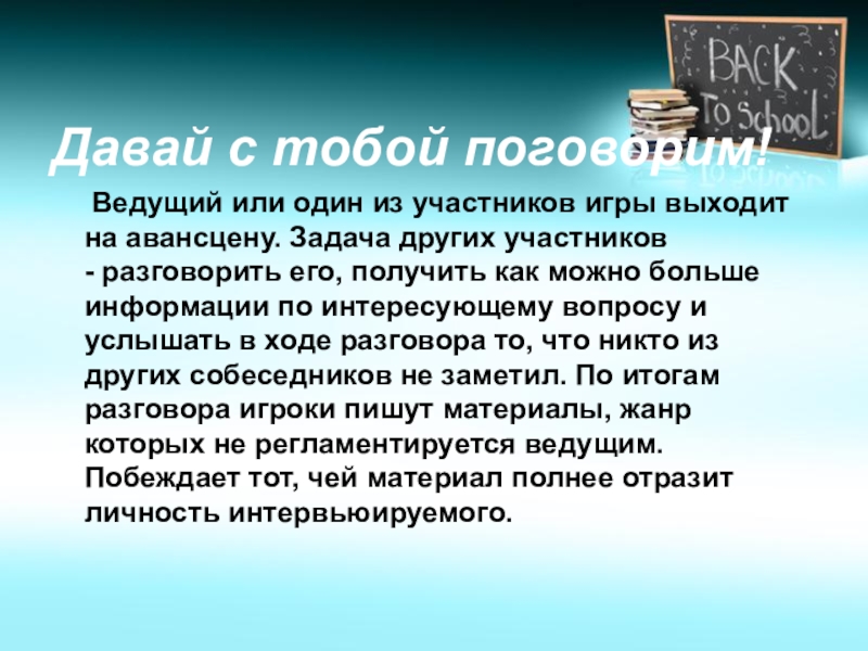из участников игры выходит на авансцену. Задача других участников - разговорить его, получить как можно больше информации по интересующему вопросу и услышать в ходе разговора то, что никто из других собеседников не заметил. По итогам разговора игроки пишут материалы, жанр которых не регламентируется ведущим. Побеждает тот, чей материал полнее отразит личность интервьюируемого.