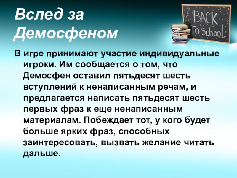 том, что Демосфен оставил пятьдесят шесть вступлений к ненаписанным речам, и предлагается написать пятьдесят шесть первых фраз к еще ненаписанным материалам. Побеждает тот, у кого будет больше ярких фраз, способных заинтересовать, вызвать желание читать дальше.