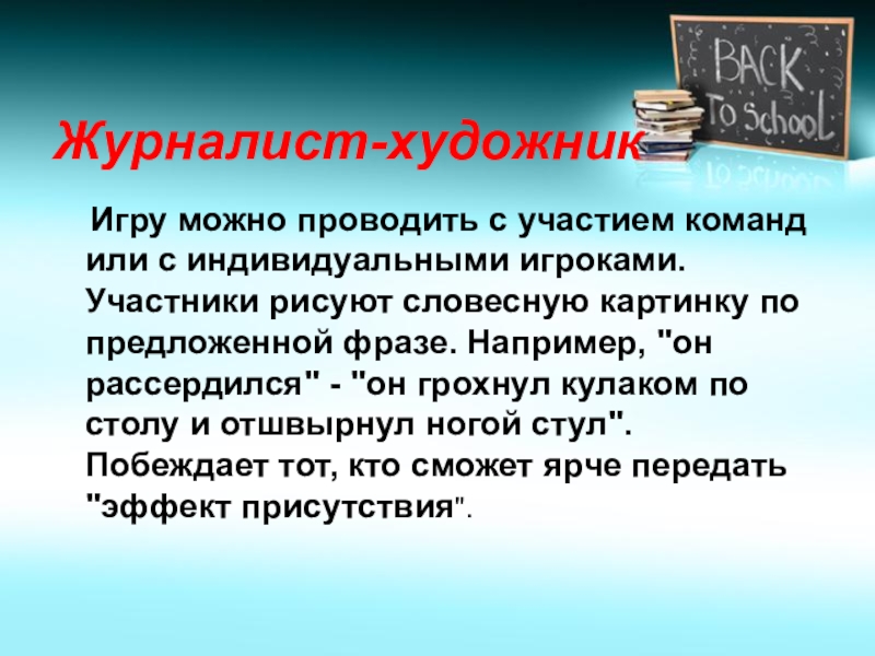 игроками. Участники рисуют словесную картинку по предложенной фразе. Например, "он рассердился" - "он грохнул кулаком по столу и отшвырнул ногой стул". Побеждает тот, кто сможет ярче передать "эффект присутствия".
