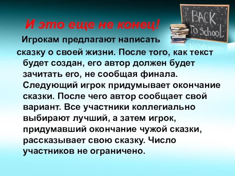 сказку о своей жизни. После того, как текст будет создан, его автор должен будет зачитать его, не сообщая финала. Следующий игрок придумывает окончание сказки. После чего автор сообщает свой вариант. Все участники коллегиально выбирают лучший, а затем игрок, придумавший окончание чужой сказки, рассказывает свою сказку. Число участников не ограничено.