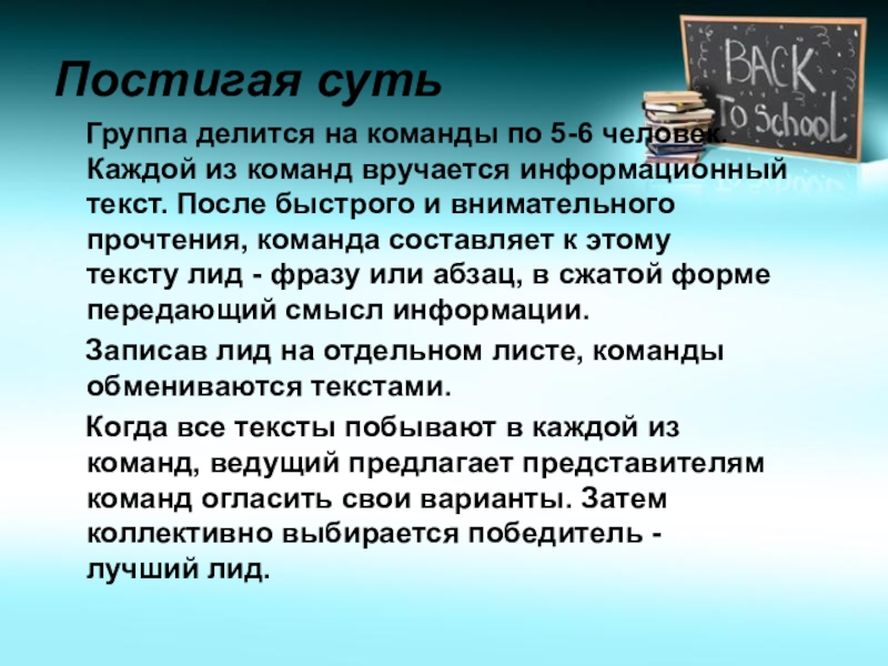 из команд вручается информационный текст. После быстрого и внимательного прочтения, команда составляет к этому тексту лид - фразу или абзац, в сжатой форме передающий смысл информации.