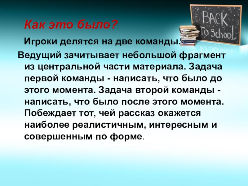 Ведущий зачитывает небольшой фрагмент из центральной части материала. Задача первой команды - написать, что было до этого момента. Задача второй команды - написать, что было после этого момента. Побеждает тот, чей рассказ окажется наиболее реалистичным, интересным и совершенным по форме.