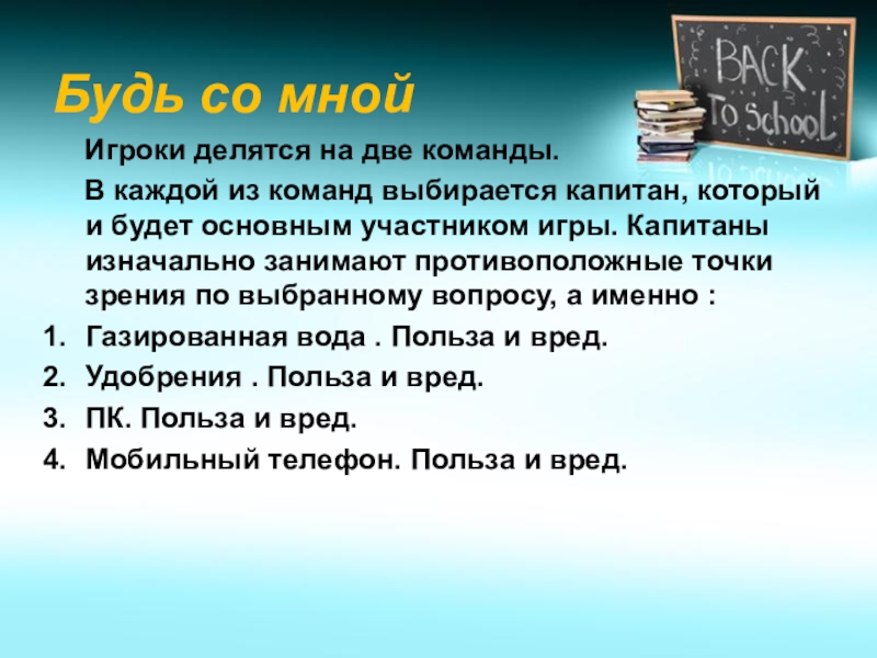 каждой из команд выбирается капитан, который и будет основным участником игры. Капитаны изначально занимают противоположные точки зрения по выбранному вопросу, а именно :