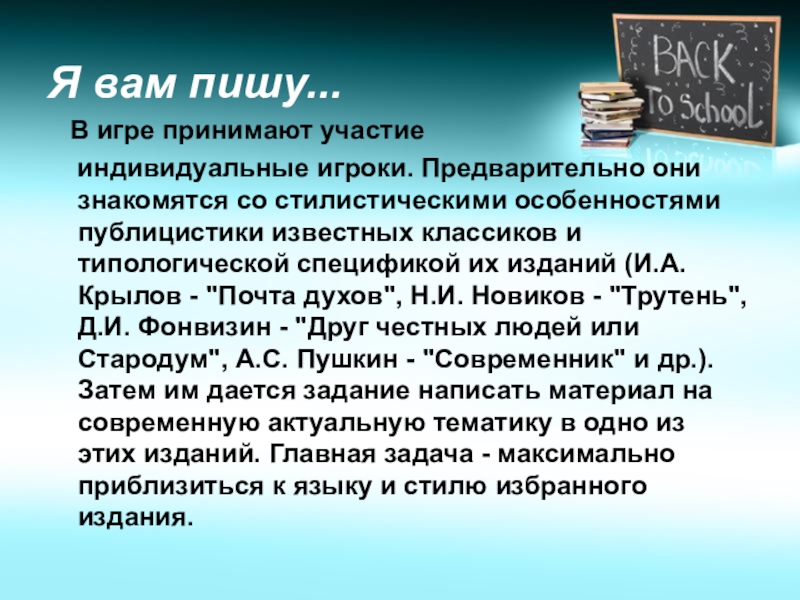 они знакомятся со стилистическими особенностями публицистики известных классиков и типологической спецификой их изданий (И.А. Крылов - "Почта духов", Н.И. Новиков - "Трутень", Д.И. Фонвизин - "Друг честных людей или Стародум", А.С. Пушкин - "Современник" и др.). Затем им дается задание написать материал на современную актуальную тематику в одно из этих изданий. Главная задача - максимально приблизиться к языку и стилю избранного издания.