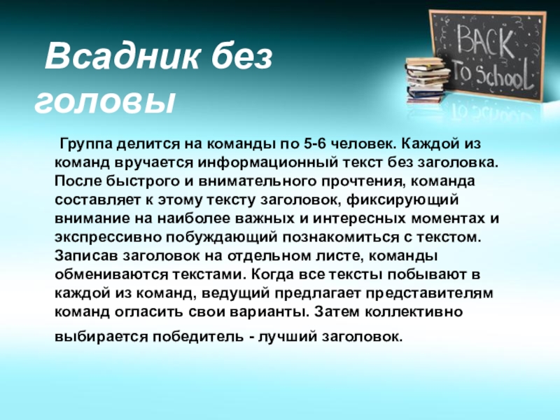 5-6 человек. Каждой из команд вручается информационный текст без заголовка. После быстрого и внимательного прочтения, команда составляет к этому тексту заголовок, фиксирующий внимание на наиболее важных и интересных моментах и экспрессивно побуждающий познакомиться с текстом. Записав заголовок на отдельном листе, команды обмениваются текстами. Когда все тексты побывают в каждой из команд, ведущий предлагает представителям команд огласить свои варианты. Затем коллективно выбирается победитель - лучший заголовок.