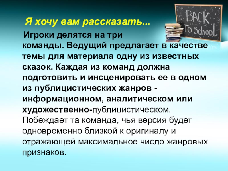 в качестве темы для материала одну из известных сказок. Каждая из команд должна подготовить и инсценировать ее в одном из публицистических жанров - информационном, аналитическом или художественно-публицистическом. Побеждает та команда, чья версия будет одновременно близкой к оригиналу и отражающей максимальное число жанровых признаков.