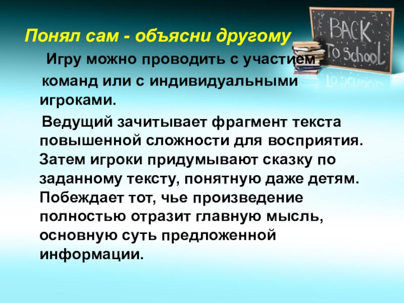 Ведущий зачитывает фрагмент текста повышенной сложности для восприятия. Затем игроки придумывают сказку по заданному тексту, понятную даже детям. Побеждает тот, чье произведение полностью отразит главную мысль, основную суть предложенной информации.