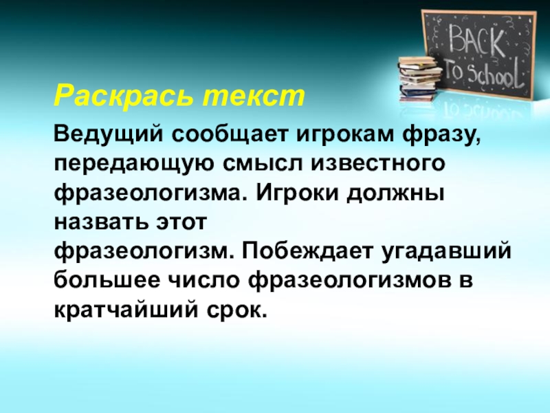 известного фразеологизма. Игроки должны назвать этот фразеологизм. Побеждает угадавший большее число фразеологизмов в кратчайший срок.