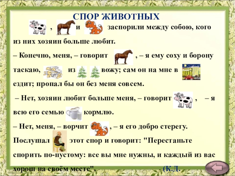 http://nsc.1september.ru/view_article.php?ID=200404202 К.Д.Ушинский «Спор животных»