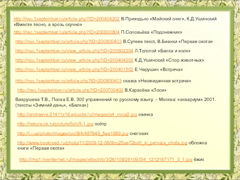 Вахрушева Т.В., Поова Е.В. 300 упражнений по русскому языку. – Москва: «аквариум» 2001. (тексты «Зимний день», «Белка»)