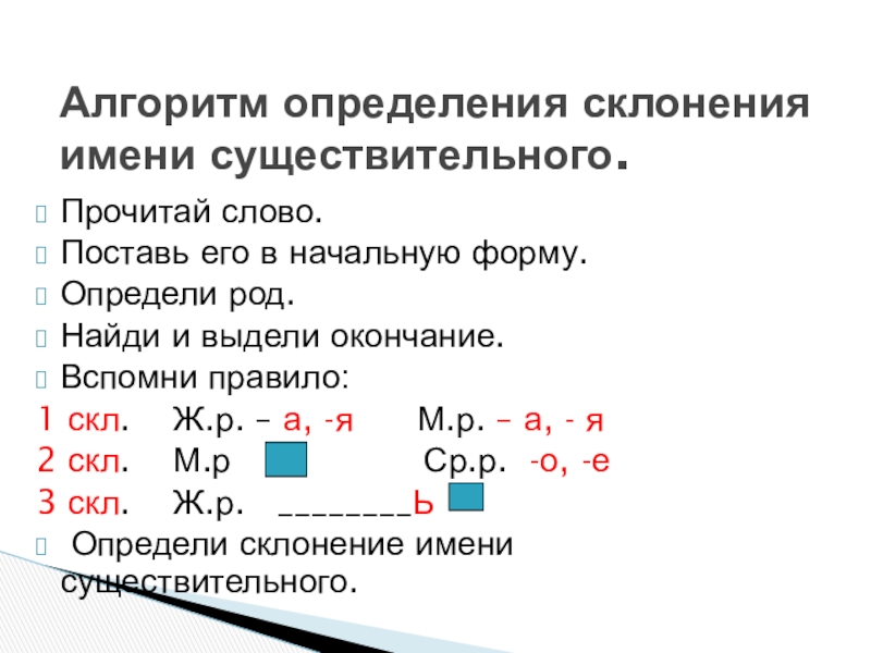 Алгоритм определения склонения имени существительного.Прочитай слово.Поставь его в начальную форму.Определи род.Найди и выдели окончание.Вспомни правило:1 скл.