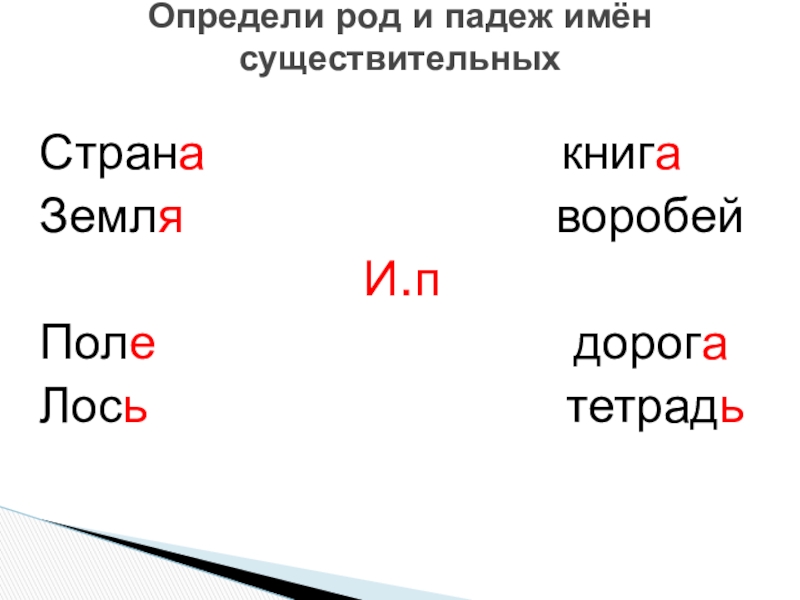 Определи род и падеж имён существительныхСтрана книгаЗемля воробей