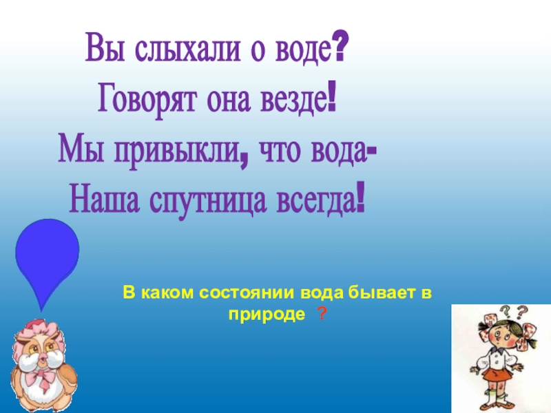 В каком состоянии вода бывает в природе ?Вы слыхали о воде?Говорят она везде!Мы привыкли, что вода-Наша спутница всегда!