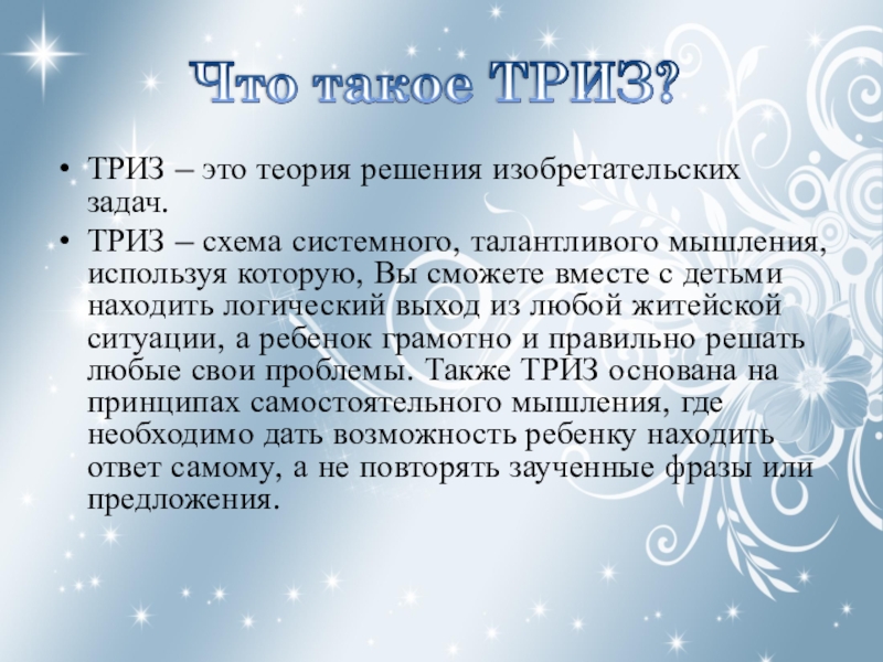 мышления, используя которую, Вы сможете вместе с детьми находить логический выход из любой житейской ситуации, а ребенок грамотно и правильно решать любые свои проблемы. Также ТРИЗ основана на принципах самостоятельного мышления, где необходимо дать возможность ребенку находить ответ самому, а не повторять заученные фразы или предложения.