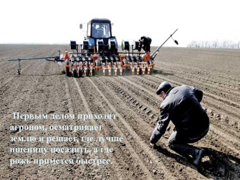 Слайд 7. Первым делом приходит агроном, осматривает землю и решает, где лучше