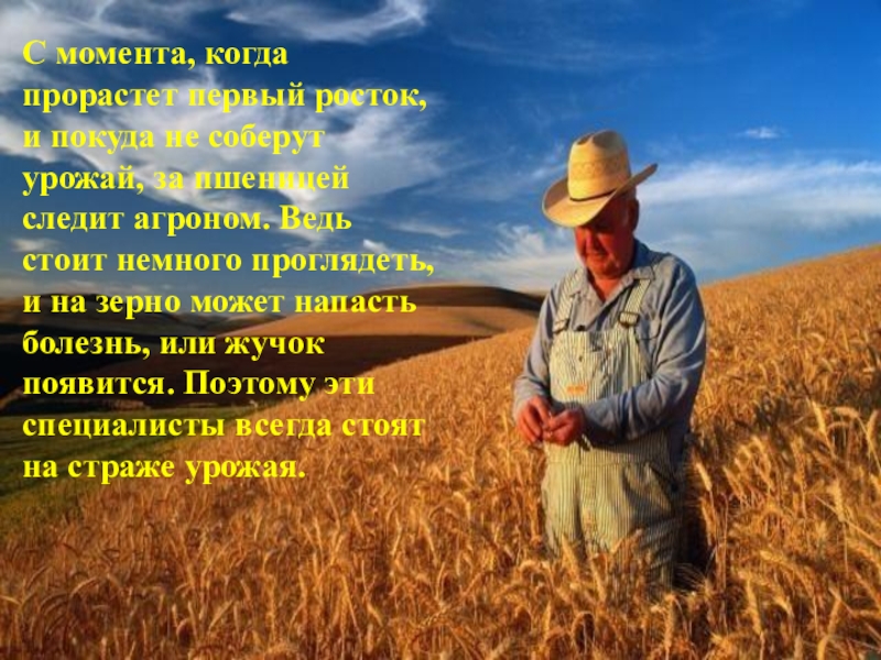 за пшеницей следит агроном. Ведь стоит немного проглядеть, и на зерно может напасть болезнь, или жучок появится. Поэтому эти специалисты всегда стоят на страже урожая.