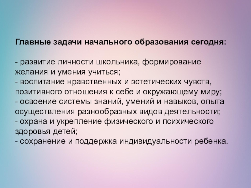 Главные задачи начального образования сегодня:  - развитие личности школьника, формирование желания и умения учиться; - воспитание