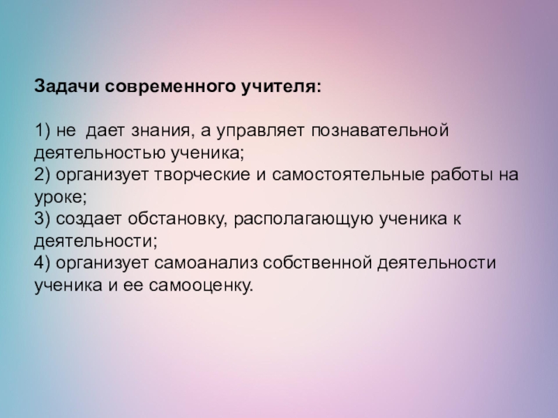 Задачи современного учителя:  1) не дает знания, а управляет познавательной деятельностью ученика; 2) организует творческие и