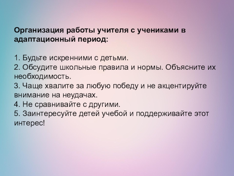 Слайд 3Организация работы учителя с учениками в адаптационный период: 1. Будьте искренними с