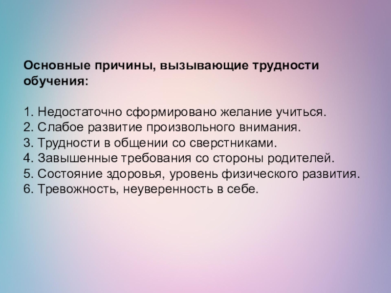 Основные причины, вызывающие трудности обучения: 1. Недостаточно сформировано желание учиться. 2. Слабое развитие произвольного внимания. 3. Трудности в общении со сверстниками. 4. Завышенные требования со стороны родителей. 5. Состояние здоровья, уровень физического развития. 6. Тревожность,
