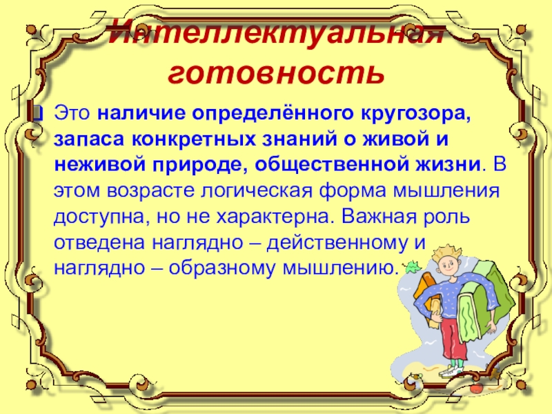 неживой природе, общественной жизни. В этом возрасте логическая форма мышления доступна, но не характерна. Важная роль отведена наглядно – действенному и наглядно – образному мышлению.