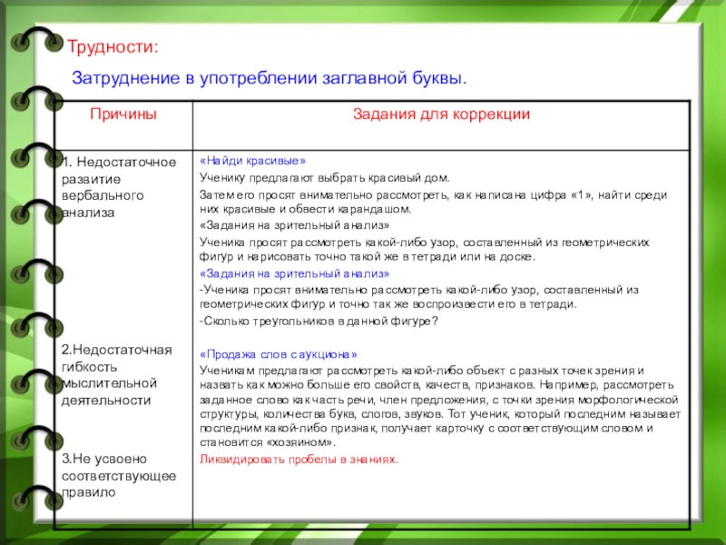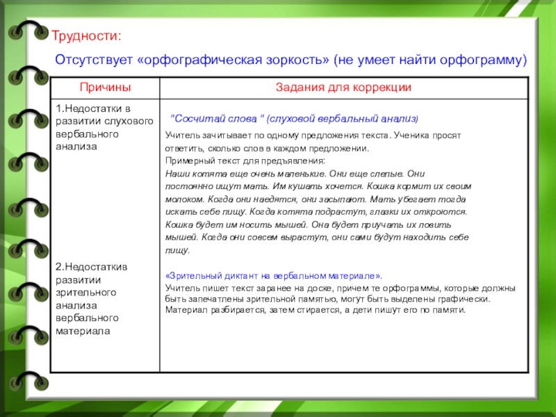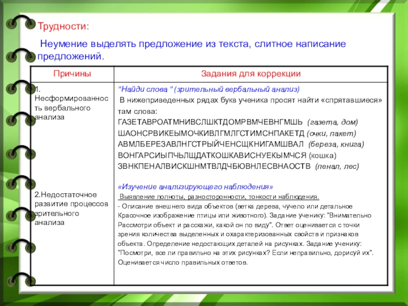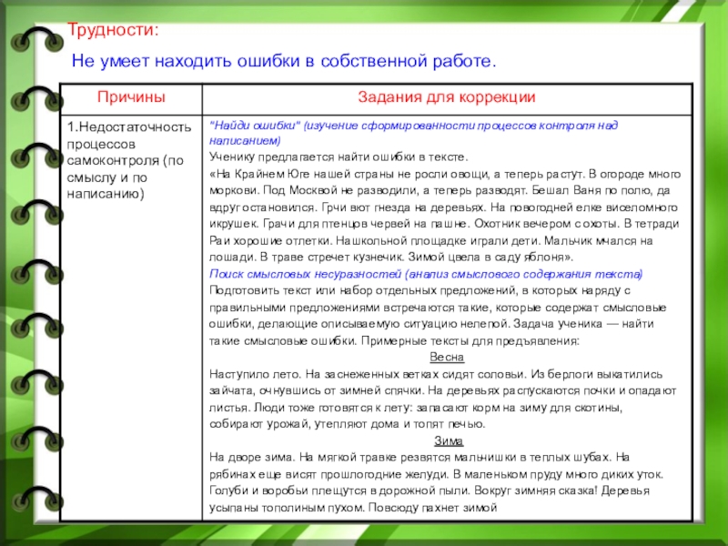 Трудности: Отсутствует «орфографическая зоркость» (не умеет найти орфограмму)