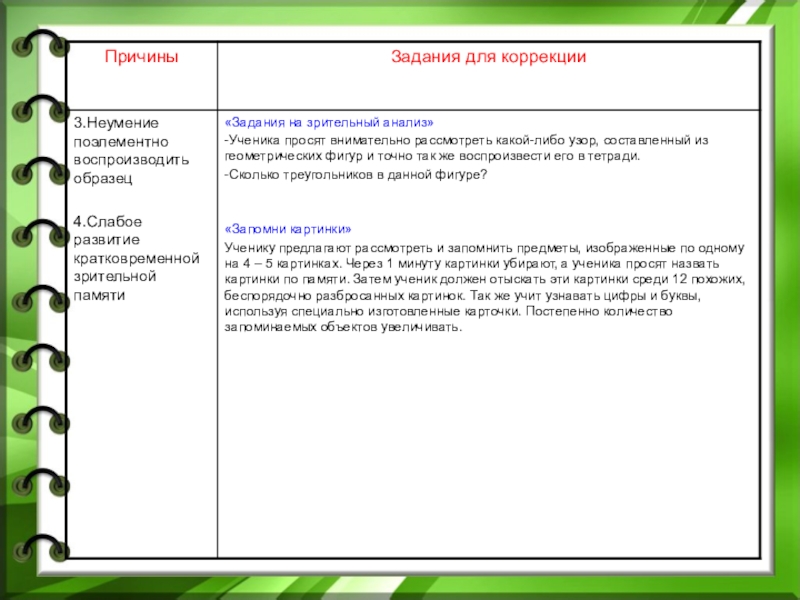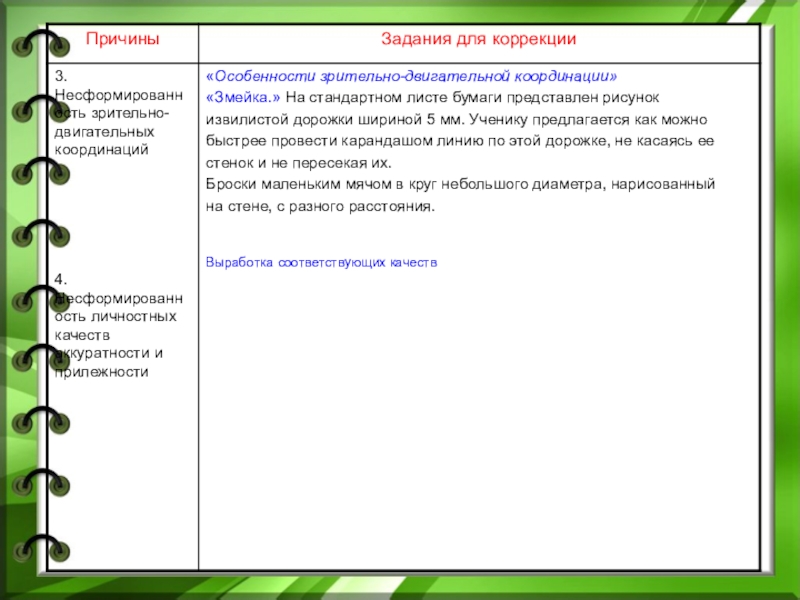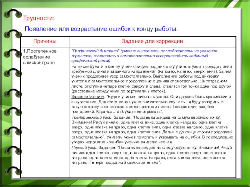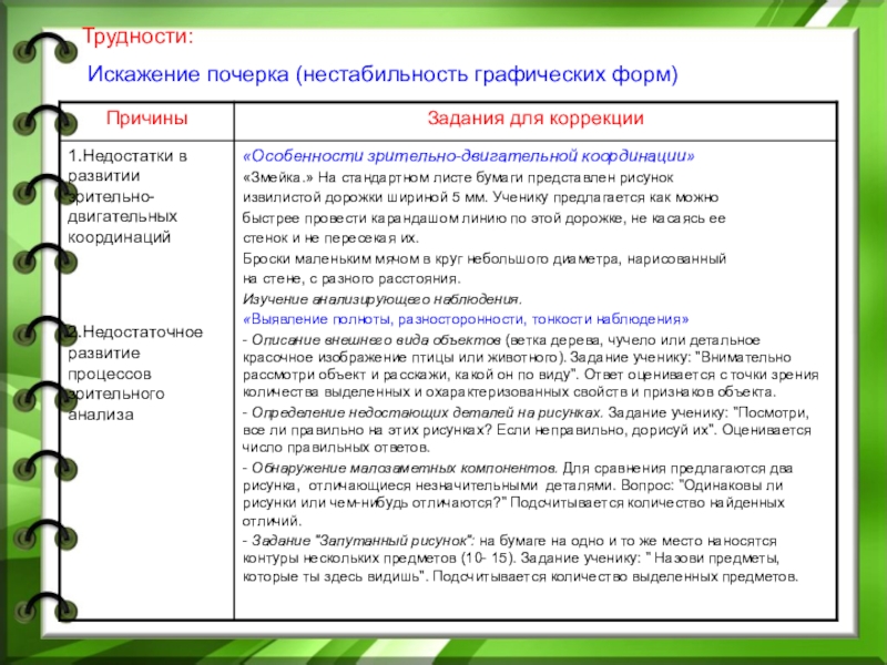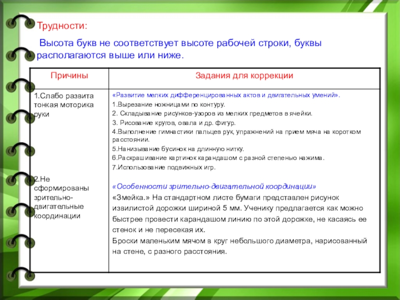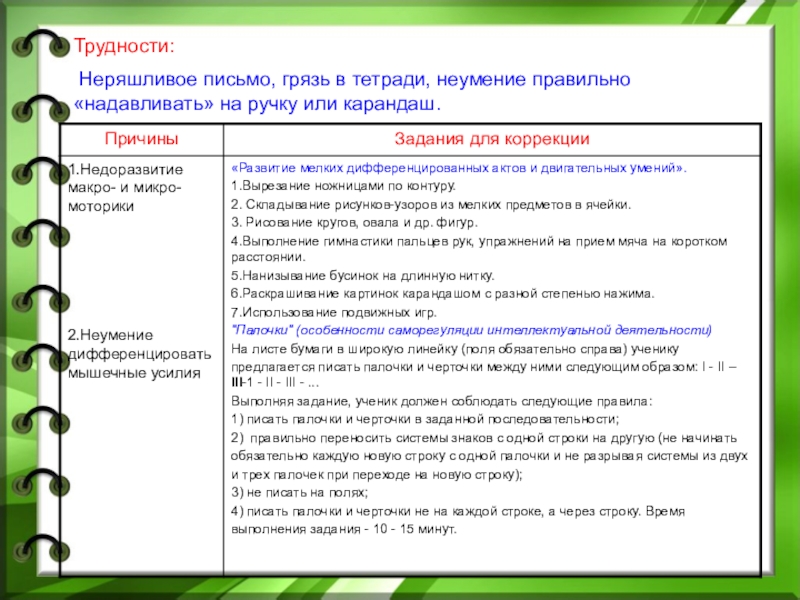 Трудности: Неряшливое письмо, грязь в тетради, неумение правильно «надавливать» на ручку или карандаш.