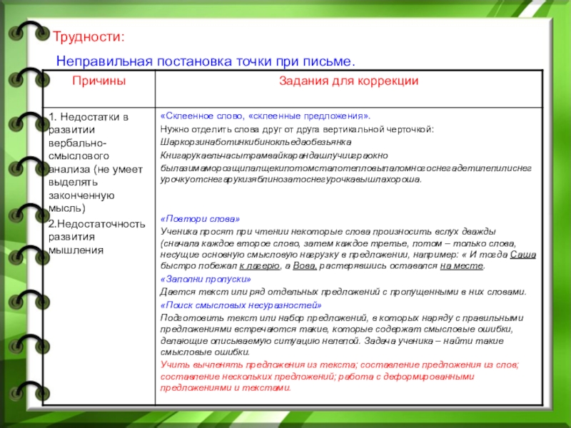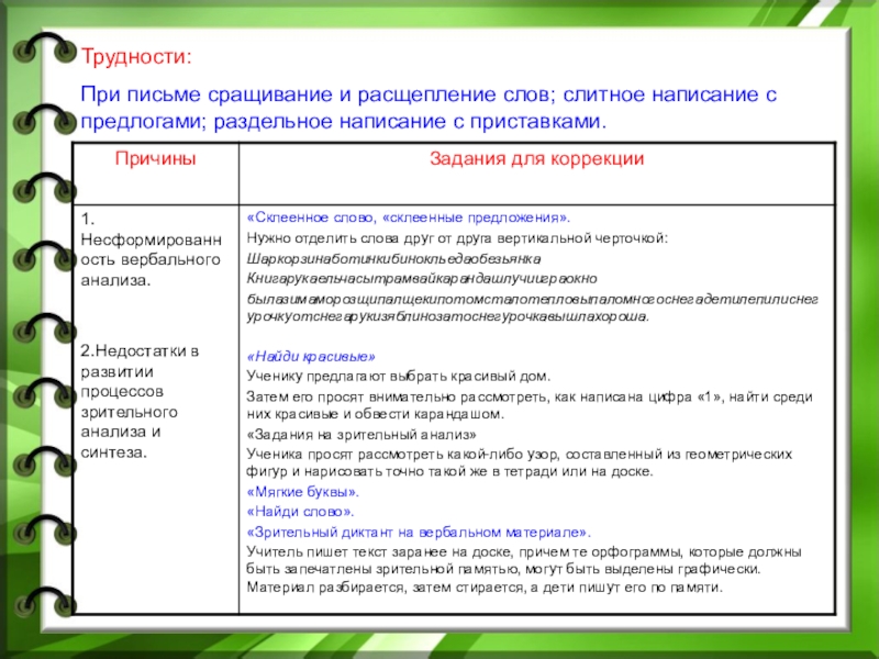 Трудности: При письме сращивание и расщепление слов; слитное написание с предлогами; раздельное написание с приставками.