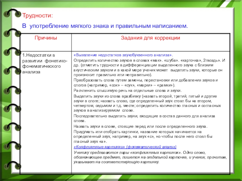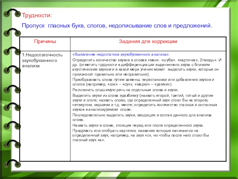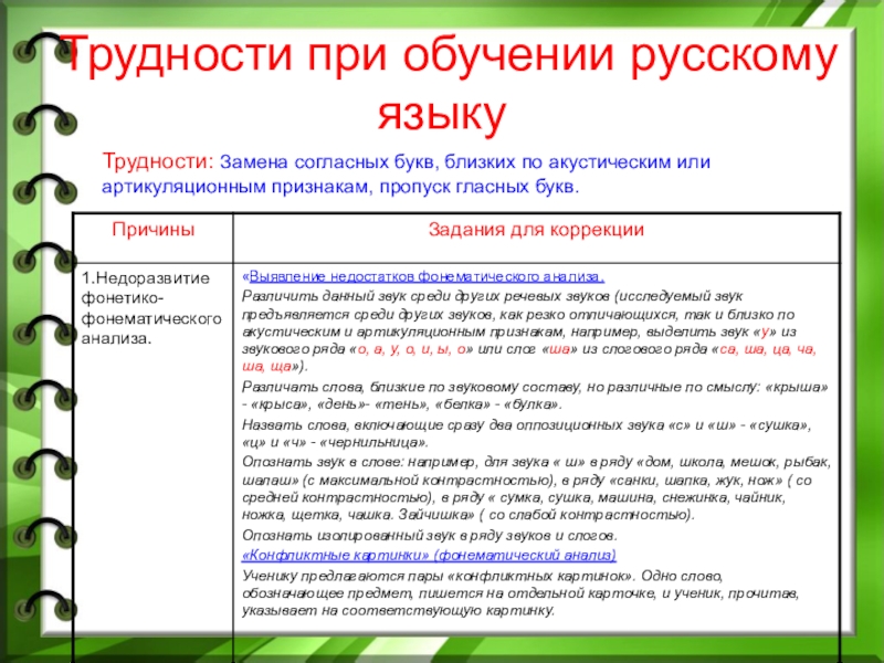 Трудности при обучении русскому языкуТрудности: Замена согласных букв, близких по акустическим или артикуляционным признакам, пропуск гласных букв.