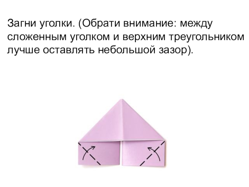 Слайд 7Загни уголки. (Обрати внимание: между сложенным уголком и верхним треугольником лучше оставлять