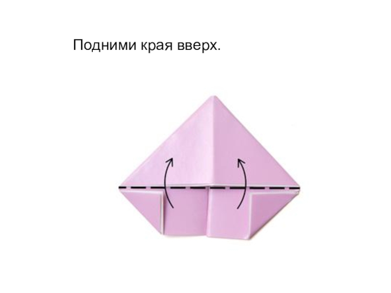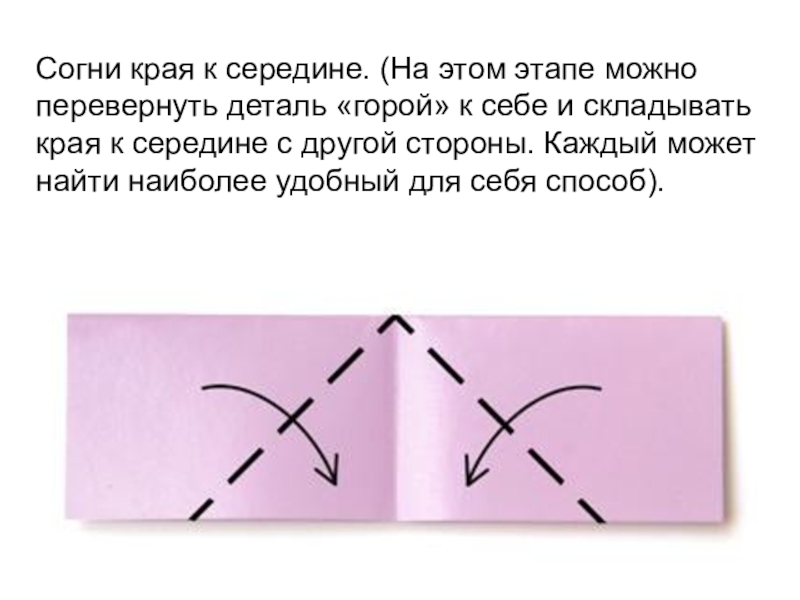 Слайд 5Согни края к середине. (На этом этапе можно перевернуть деталь «горой» к себе и складывать